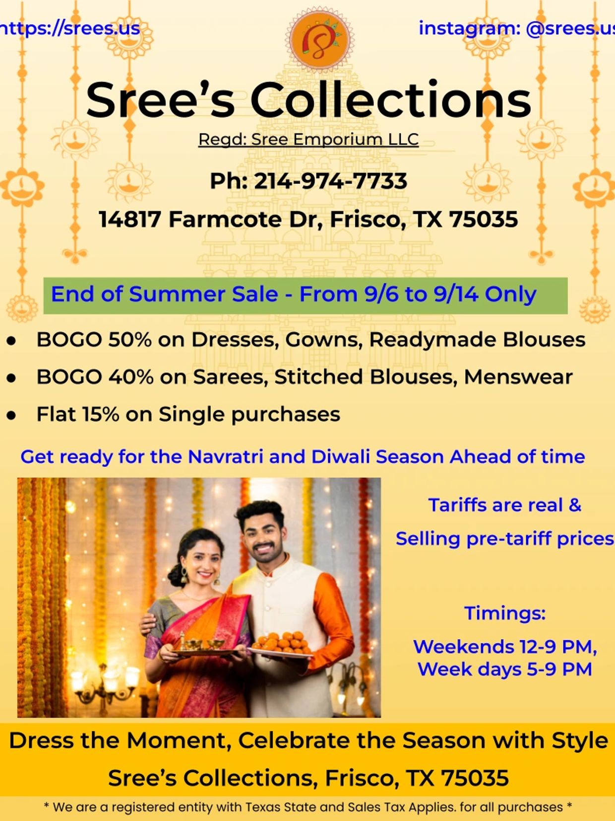 Alert: End of Summer Sale BOGO 50% on Dresses, BOGO 40% on Sarees, and Menswear.